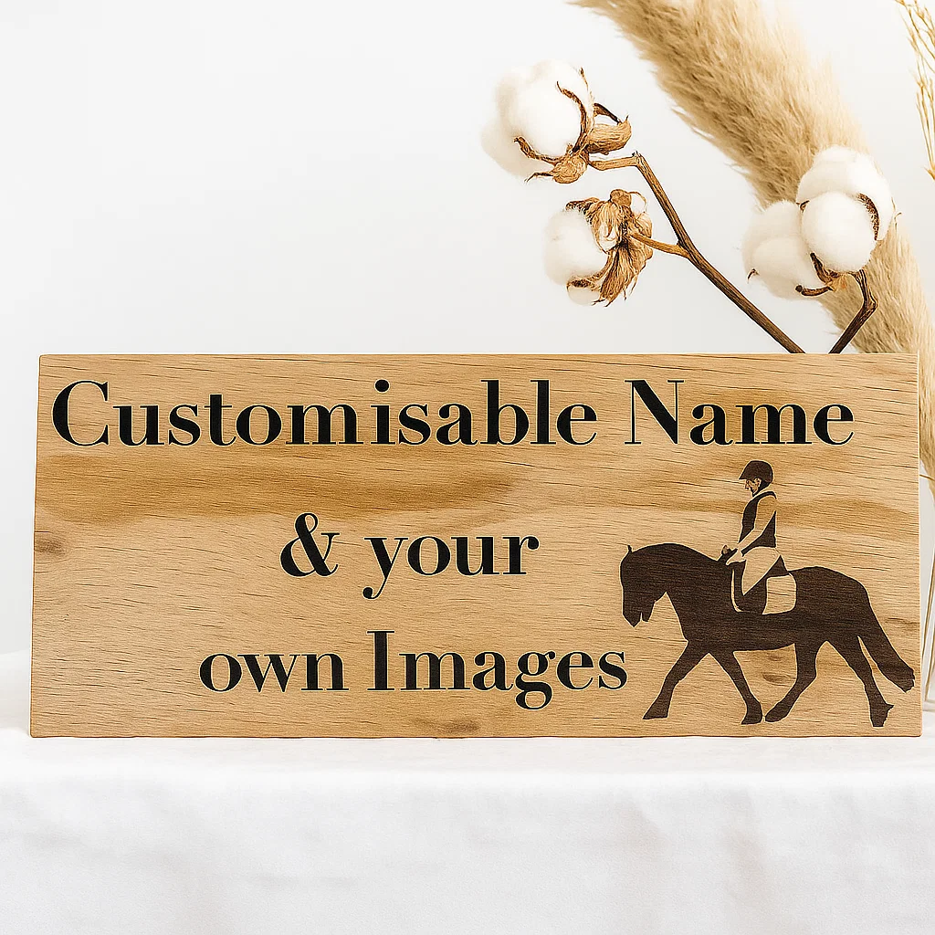 Celebrate your horse with a handcrafted oak stable sign, engraved with their name and your chosen photo for a truly personal touch.